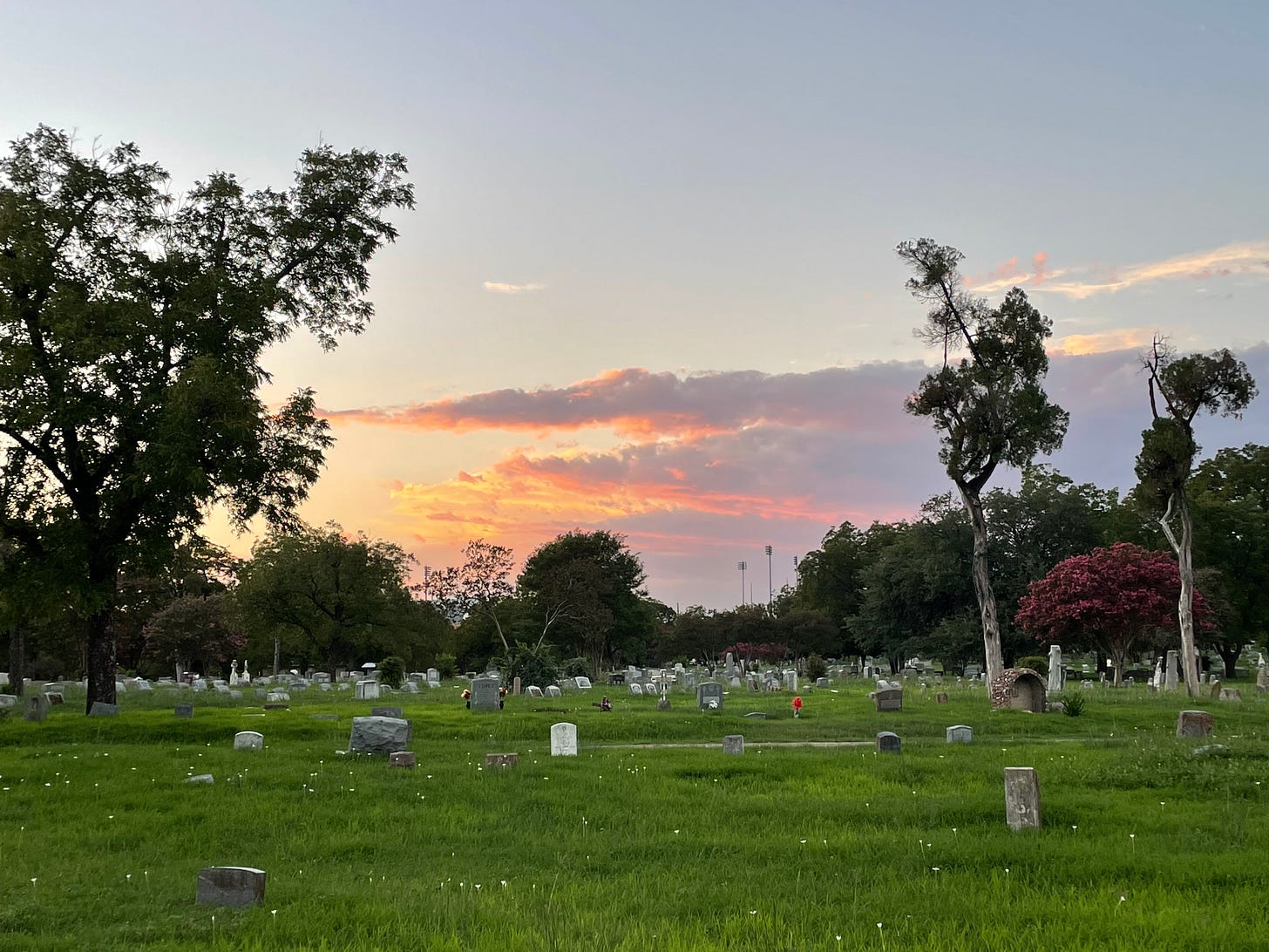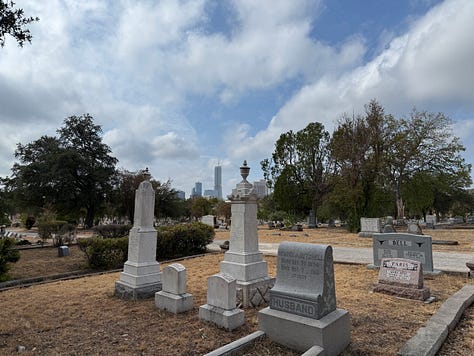 Oakwood Cemetery has become part of the backdrop of life in my Central East Austin neighborhood. We walk by it daily with our dog—she’s not allowed inside—but sometimes I wander among the tombs, the glass monuments of downtown rising behind the stone ones. Laid out beyond the young capital’s edge, Oakwood now sits in the middle of it, bordered by homes, a Denny’s, a coffeeshop, a hotel, and the University of Texas sports complex. Had the city’s founders known their frontier capital would become a metropolis, they might not have placed the cemetery so close to downtown. As it stands, the cemetery is likely to remain a literal dead zone in the heart of the city for generations to come.