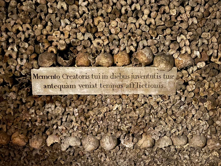 To echo British comedian Eddie Izzard, I have a somewhat morbid fascination with cemeteries—from La Recoleta in Buenos Aires to Center Street Cemetery in my hometown of Wallingford, Connecticut, I’ve sought out famous graves, beautiful stonework, and the secrets they hold. Last year, we visited the Catacombes in Paris, a 1.5-kilometer subterranean warren of tunnels lined with, even built from, the bones of some six million bodies. Visitors are greeted by the arresting inscription: Arrête! C’est ici l’empire de la Mort (“Stop! The empire of Death lies here”). Inside, the skulls of peasants rest on the femurs of noblemen—at least in death, the egalité and fraternité promised by the French Revolution rings true.