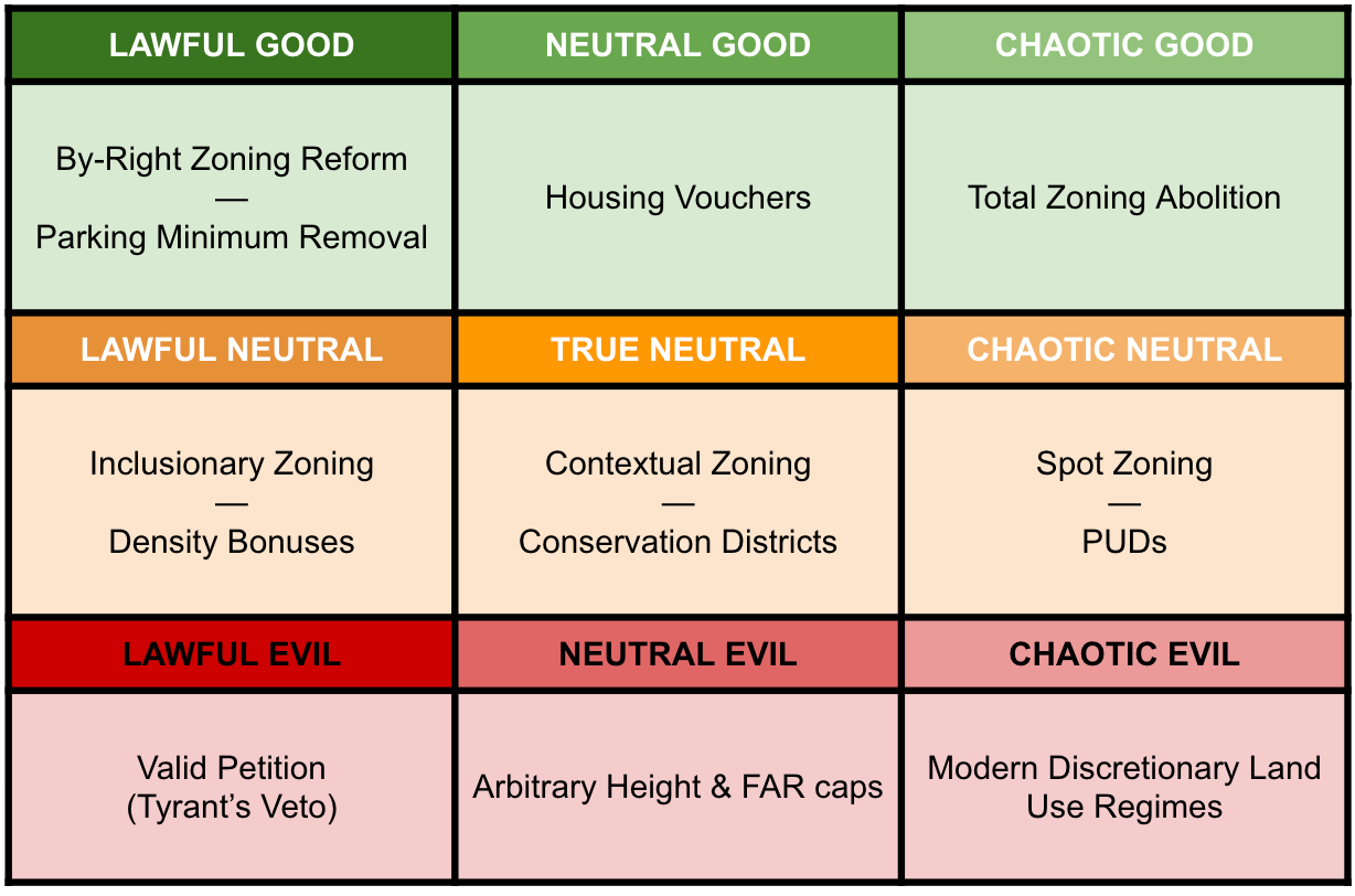 One of the premises of the D&D Alignment Chart is that character profiles can drift, and the same is true of systems. No city adopts Chaotic Evil by ordinance. What begins as Lawful Neutral can, over time, slide—not because anyone chose malice, but because rigidity gives way to exceptions, exceptions give way to negotiation, and negotiation gives way to arbitrary power. The result is a regime that still looks lawful on paper but operates chaotically in practice, rewarding delay, extraction, and obstruction rather than compliance with clear rules. The housing crisis is best understood not as a failure of intentions, but as a failure to keep our land-use systems anchored to lawfulness. And so we have modern zoning regimes that are illegible, illiberal, and zero-sum—that almost require the invention of villains and victims to function.