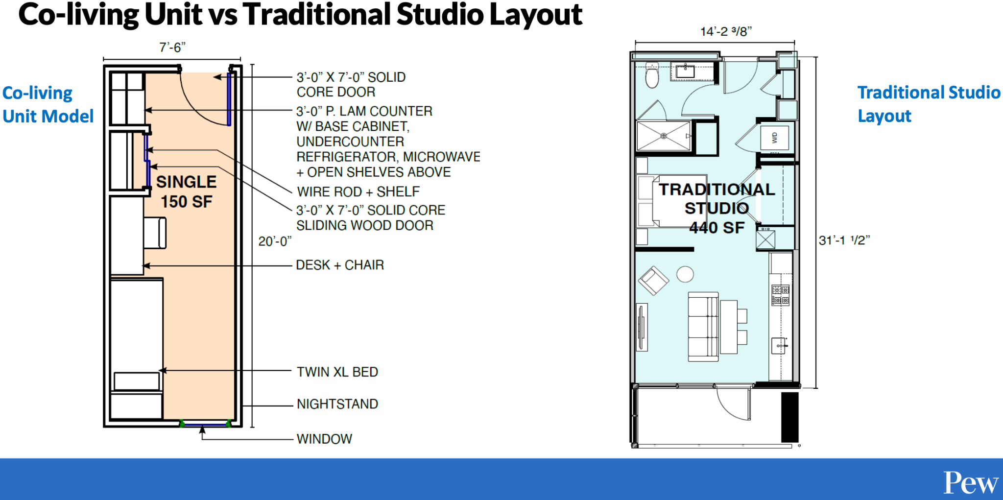 Horowitz argues cities should make shared housing—“co-living,” in today’s parlance—legal again. Office vacancies are soaring at the same time deeply affordable housing is vanishing. Horowitz and the architecture firm Gensler modeled what cities could actually build. Their analysis suggests that a vacant office tower could be converted into deeply affordable rooms for half the per-unit cost of new studio apartments. A typical 120–220 square foot unit with shared kitchens and bathrooms could rent to people earning 30–50% of area median income. Urban development has become so expensive that such conversions are likely to only be feasible if subsidized, but Horowitz argues that conversions offer a better way to leverage scarce public dollars: for instance, a $10 million budget might produce 125 co-living rooms instead of 35 studios, providing a way to scale deeply affordable housing much more quickly.
