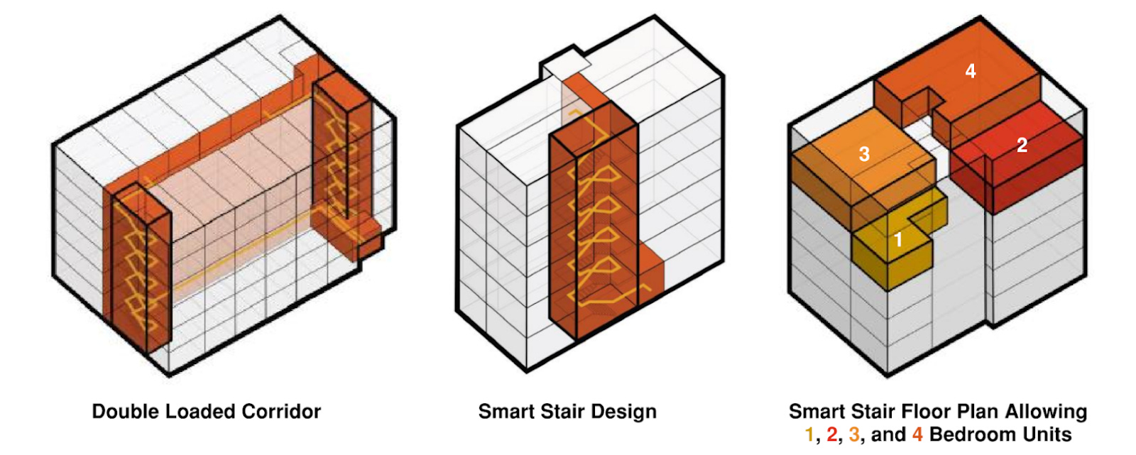 Small, single-stair apartment buildings are the “missing middle” of housing in American cities, offering more attainable homes to middle-income households. Historically, small apartment buildings were a common feature of residential neighborhoods across American cities. As a Pew study notes, although small- and medium-sized apartment buildings comprise 40% of the rental stock, “only 21% of all housing units built since 2000 in the U.S. have been in apartment buildings with two to 19 units.” Meanwhile, 42% of all new units built in the same timeframe are in buildings with 50 or more units. Zoning plays a role, but in most cities, the missing middle is missing because of building code regulations like dual-stairway requirements.