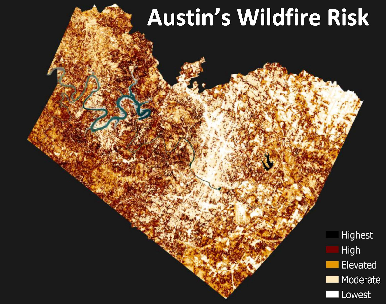 Incidentally, CoreLogic ranks Austin fifth nationally for wildfire risk—behind only four cities in Southern California. In response, Austin Fire is calling on the City Council to adopt a new wildfire risk map, one that would put 71% of Austin’s land parcels in a vulnerable zone, up from 38% ten years ago. The riskiest parts of the city are its least dense suburbs, which sprawled into the parched Hill Country. The dense urban core—shown as a white patch in the map below—is at the lowest risk.