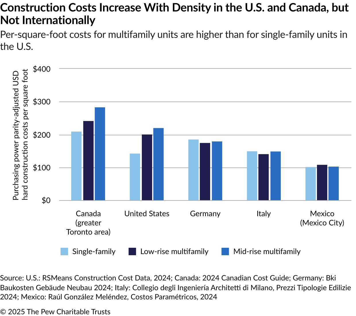 In Europe and much of Asia, single-stair buildings make more efficient use of space, allowing for better floor plans, ventilation, and natural light. With apartments clustered around a central landing instead of split by a hallway, these buildings often offer all-corner units that can accommodate two to three bedrooms—and urban families. According to Pew, the more efficient floor plates of single-stair buildings can reduce construction costs by 6% to 13% compared to similar dual-stairway buildings. Elsewhere in the world, construction costs remain consistent across residential building types. In the US, however, the IBC effectively penalizes density, pushing up costs as buildings get taller or house more units.