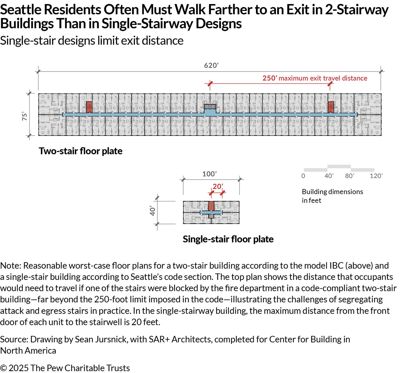 Pew finds that if single-stair buildings are: built with fire-safe materials; equipped with sprinklers, smoke detectors, and other fire suppression systems; limited in height (up to 75’, in reach of a fire ladder truck), floor area, unit count, and exit distance; and include smoke-control systems and other protections, then they are “at least as safe” as other types of apartment buildings. All such provisions are in the Austin proposal.