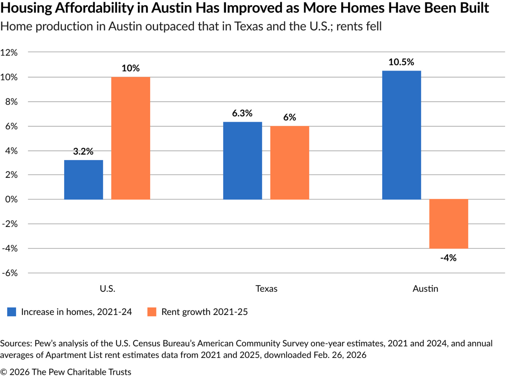 As Pew writes in a new report, Austin built housing at a rate three times that of the national average from 2015 to 2024, adding 120,000 homes—a 30% increase in the housing stock. The result was striking: rents fell even as the city continued to grow, adding another 18,000 people from 2022 to 2024. In fact, Austin appears to have temporarily overshot demand, building enough housing to push rents down despite continued population growth. Critics have pointed to a “glut” of luxury apartments to explain this decline, but the data suggest something else. Rents fell by only 2.6% in newer luxury buildings—and by 11.4% in buildings catering to lower-income renters. As Austin’s high-tech growth machine brought in higher-income workers, those residents moved into new buildings instead of competing for older housing, easing pressure across the market. Few major U.S. cities have built at anything like this pace; in supply-constrained markets like New York and San Francisco, high-income residents are more likely to bid up older housing instead. Most of Austin’s boom, however, took the form of large apartment buildings, which have made up 47% of all homes built since 2015, compared to 25% of detached single-family homes.